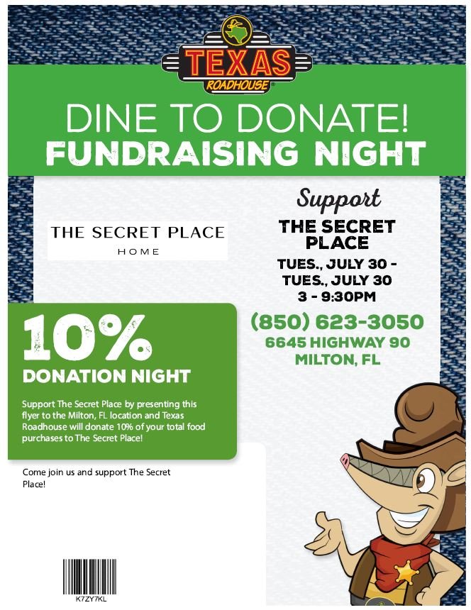 Bring the below flyer into Texas Roadhouse in Milton on 30-Jul-2024 between 3pm and 9:30pm, show it to your server and 10% of your bill will be donated to The Secret Place Home. You do not have to have a printed copy of the flyer, you can simply show a digital copy. :)